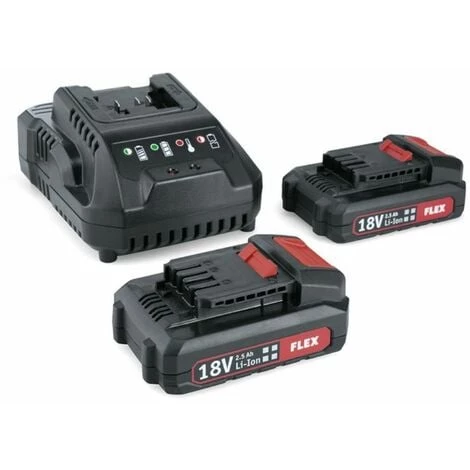 Flex 18V 2x batterie 2,5 Ah + Set chargeur d’alimentation 22 Q Ensemble composé d’un chargeur de 18,0 volts et deux batteries 2,5 Ah 18,0 V.